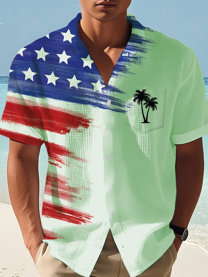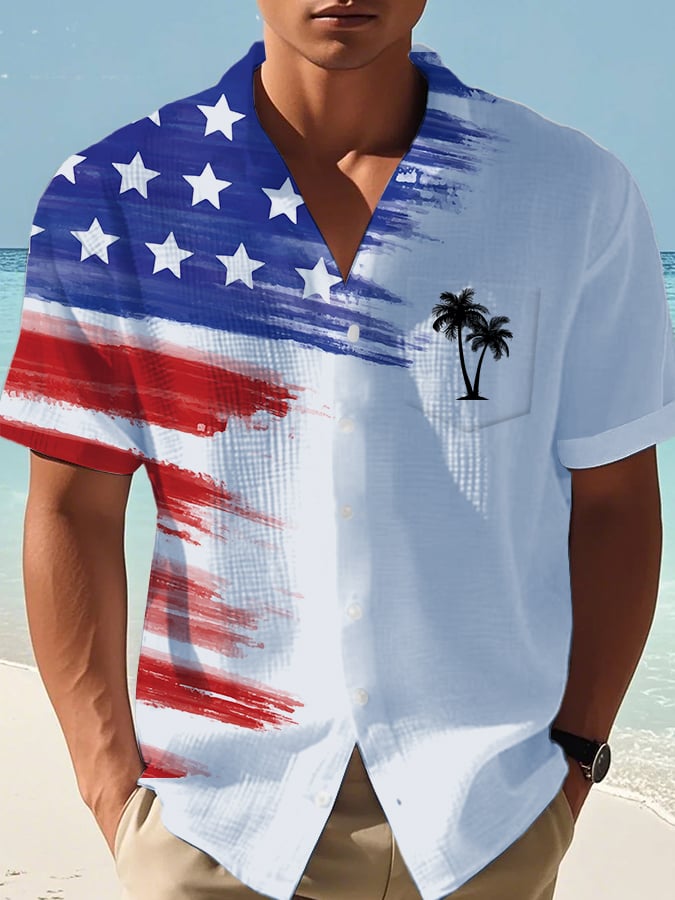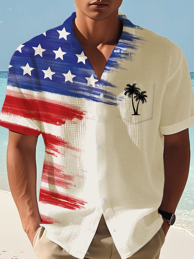 Men's Casual Independence Day Fireworks Waffle Short Sleeve Shirt (With Pockets)